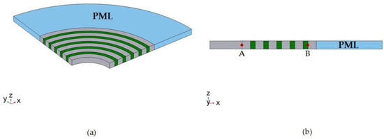 By calculating the elastic wave transmission curve, the existence and ability of the proposed RAM-PnC acoustic band gap can be evaluated. Different from the infinite scattering array used for the dispersion relation, the model used for transmission spectrum analysis is a finite scattering array. As shown in Figure 4, there are five periodic units arranged alternately in the radius direction. A is the excitation port, B is the receiving port, and the outermost layer is the PML layer with a length of 5a. The transmission loss is defined by the following equation: