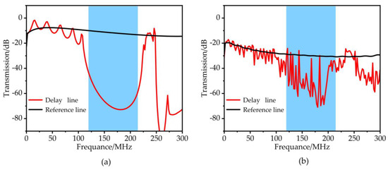 The transmission characteristics of the phononic crystal array obtained using the delay line model and the reference line (all materials are Si) are calculated in the frequency range of 0–300 MHz, as shown in Figure 5. The band gap is formed in the range of 122–225 MHz, and the propagation of the acoustic wave is adequately suppressed. As shown in Figure 5a, under the condition of two-dimensional simulation, the ability of acoustic waves to suppress reduces the acoustic wave transmission coefficient by 60 dB at a frequency of 175.14 MHz. As shown in Figure 5b, under the condition of three-dimensional simulation, the acoustic wave’s suppression ability reduces the acoustic wave transmission coefficient by 45 dB at a frequency of 175.14 MHz.
