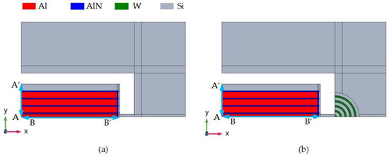 Simulation diagrams of quarter piezoelectric MEMS resonators: (a) the traditional-type TPOS MEMS resonator; (b) RAM-PnC TPOS MEMS resonator.