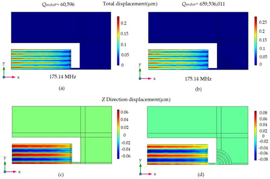 The mode of the resonator obtained via a simulation is shown in Figure 7. Figure 7a shows the total displacement distribution of the nine-order broadened resonance mode of the traditional resonator. Figure 7b shows the total displacement distribution of the ninth-order-stretched resonant mode of the RAM-PnC resonator. Figure 7c shows the Z-direction displacement distribution of the ninth-order-stretched resonant mode of the ordinary resonator. Figure 7d shows the Z-direction displacement distribution of the ninth-order-stretched resonant mode of the RAM-PnC resonator. The simulation results show that integrating the RAM-PnC array on the resonator can increase the resonator’s quality factor from 60,596 to 659,536,011.