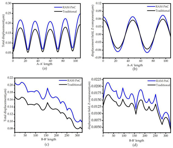 The (a) total displacement field (μm) diagram and (b) Z-direction displacement field (μm) diagram of the traditional resonator and the RAM-PnC resonator in the 9th-order width extension mode on the A-A′ cross-section, and the (c) total displacement field (μm) diagram and (d) Z-direction displacement field (μm) diagram of the traditional resonator and the RAM-PnC resonator in the 9th-order width extension mode on the B-B′ cross-section.