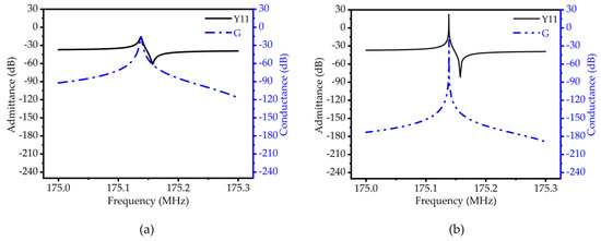 (a) Schematic diagram of admittance (Y11) and susceptance (G) curves of traditional TPOS MEMS resonators; (b) RAM-PnC MEMS resonator admittance (Y11) and susceptance (G) curve diagram.
