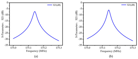 To further obtain the equivalent circuit parameters of the resonator, the frequency domain simulation of the resonator based on 50-ohm impedance matching is carried out using the finite element method, and the Y11 curve and S21 curve are obtained, respectively. The simulation results are shown in Figure 9 and Figure 10. From Equations (11)–(14), the various parameter values of the piezoelectric MEMS resonator are solved. Since there is no load in the simulation process, the no-load quality factor (Qu) can be obtained by calculating the 3dB bandwidth.
