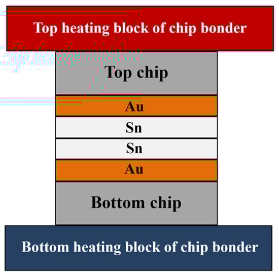 The bonding structure of Au-Sn microbumps is illustrated in Figure 1, featuring the Au/Sn-Sn/Au sandwich structure of the bumps. The Au bumps are dimensionally congruent with the Sn bumps, with a size of 10 × 10 µm. Heat conduction through the top and bottom ceramic heating blocks facilitates isothermal heating. Alternatively, a temperature gradient can be formed by maintaining different temperatures at the top and bottom heating blocks.