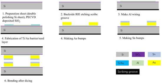 In this study, the process was initiated by creating scribe grooves and alignment marks on the backside of a 550 mm thick double-throw silicon oxide wafer by Reactive ion etching. This step is essential for facilitating subsequent alignment bonding. Then, an Al metal layer with a thickness of 1 µm was deposited by sputtering and etched by the wetting process. The Au/Sn microbumps were then fabricated by an electroplating and evaporation process, respectively. The Au/Sn microbumps had a thickness of 4 µm/2 µm. Subsequently, wafers were sliced into a bottom bonding chip with 1.2 cm × 1.2 cm and a top bonding chip with 1 cm × 1 cm. These chips were placed on the bonding equipment for pre-bonding experiments, as illustrated in Figure 2.