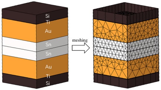 As depicted in Figure 3, the simulation modeling is based on the actual size of the microbumps. The silicon oxide layer, seed layer, and Al wiring layer were excluded because the focus was on simulating the heating device in the bonding process by applying temperatures at the ends of the top and bottom Si sheets. This study employed mesh delineation to create the model.