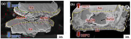To reveal the underlying reason for the high strength of the gradient bonding, IMC comparison was first conducted between the isothermal bonding and thermal gradient bonding. Figure 6a,b depict the cross-sectional morphology of Au-Sn/Sn-Au bumps after the isothermal bonding at uniform temperatures of 200 °C and 300 °C for 10 min, respectively. Figure 6a demonstrates there is a small amount of Au5Sn and Au-Sn phases at the interface based on the energy-dispersive spectroscopy. However, a substantial quantity of metallic Sn remained unconsumed for the IMC formation. This illustrates that the IMC, at the temperature of 200 °C for 10 min, forms quite slowly and the temperature alone is insufficient for inducing high growth rates. Then, the isothermal bonding temperature rose to 300 °C to increase the IMC growth rate. Figure 6b presents the cross-sectional morphology of IMC at the bonding temperature of 300 °C for 10 min. It is evident that most of the metallic Sn within the bonding area was almost consumed within 10 min, resulting in the formation of two phases: Au5Sn and Au-Sn. The rationale behind this observation is that the bonding temperature of 300 °C surpasses the melting point of metallic Sn. Consequently, Sn exists in a molten state during the bonding process, facilitating diffusion. However, Sn overflow will happen and leads to larger bonding interface size. Additionally, high temperatures may pose the risk of device damage.