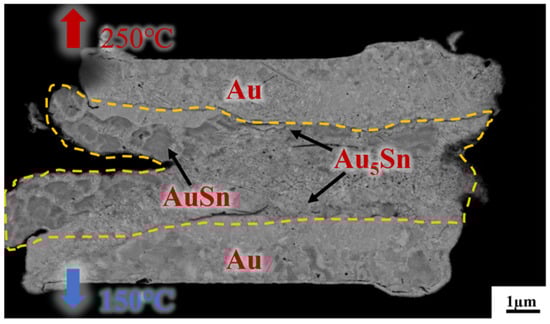 Figure 7 presents a cross-sectional view of Au/Sn-Sn/Au bumps at the thermal gradient bonding (TGB) with the temperature of 250 °C at the top heating block and 150 °C at the bottom heating block for 10 min. It shows the IMC thickness was larger than that at the isothermal temperature of 200 °C and resulted in more Au5Sn and Au-Sn phases in the IMC region. This means the bonding process consumed a significant portion of metallic Sn. This particular configuration also proves that the high bonding strength (23.898 MPa in Figure 5) comes from the thick IMC for TGB bonding with a temperature gradient of 150 and 250 °C. The high strength can satisfy the subsequent chip stacking, credited to the abundant Au5Sn and Au-Sn grains.