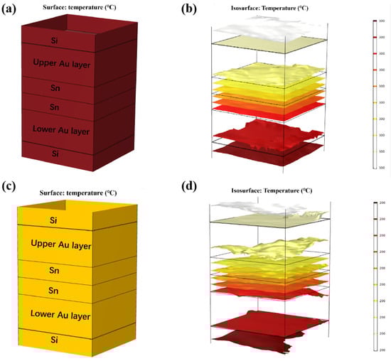 Thermal diffusion simulation of isothermal bonding at 300 °C: (a) temperature distribution diagram; (b) isotherm distribution diagram. Thermal diffusion simulation of isothermal bonding at 200 °C: (c) temperature distribution diagram; (d) isotherm distribution diagram.