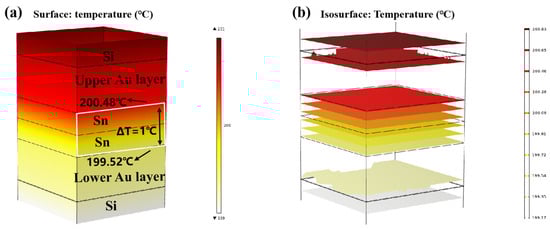 Thermal diffusion simulations of isothermal bonding and TGB bonding were all conducted. The material parameters are shown in Table 1. First, isothermal bonding simulation was designed, as below. Considering that the Au-Sn bonding temperature typically exceeds 280 °C, the temperatures of the top and bottom heating blocks were set to 300 °C and 200 °C, as shown in Figure 8. The ambient temperature was set to 25 °C. The results, depicted in Figure 8a–d, revealed that the temperature within the Au/Sn bumps reached the thermal equilibrium after 10 min, yielding overall temperatures of 300 °C and 200 °C, respectively.