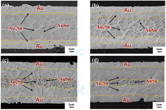 To reveal the IMC evolution, the annealing test was carried out on the blanket Au-Sn-Au without a bump in the gradient bonding. Figure 10 separately illustrates the cross-section observation of the as-bonded samples and samples subjected to varying annealing times. In Figure 10a, it was revealed that two phases, Au5Sn and Au-Sn, are formed for as-bonded samples. The Au5Sn phase evenly distributes in the upper and lower interconnections within the reaction zone. The IMC morphology takes a like-dendritic form. The Au-Sn phase is enveloped by the Au5Sn phase. Figure 10b illustrates the bonding interface after 30 min annealing. At this stage, Sn is completely depleted and transformed into two phases: Au5Sn and Au-Sn. It is noticeable that Au-Sn starts to decrease in size with there is an increase in surrounding Au5Sn. The reason for this is due to the fact that long-time annealing causes more Au to react with Au-Sn, and more Au5Sn occurs. The continuous emergence of Au5Sn comes at the expense of Au and Au-Sn consumption [], progressively reducing the Au-Sn grains. Simultaneously, the IMC thickness in the center with Au-Sn surrounded by Au5Sn becomes smaller. Figure 10c further convinces this assumption. After 60 min annealing, the Au-Sn size continues shrinking. The IMC interface including both Au-Sn and Au5Sn becomes smaller, which is hard to discern. Only a more pronounced IMC interface with a thickness of approximately 1 µm in the center was found. After 120 min of annealing treatment, as shown in Figure 10d, the conspicuous IMC interface almost disappears, leaving a large area of Au5Sn and Au.
