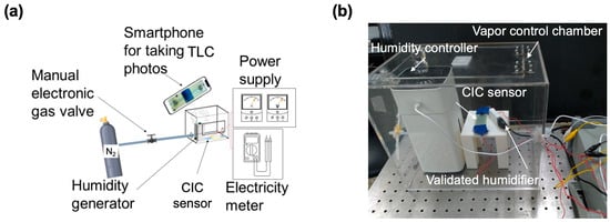 The experimental arrangement for assessing ambient humidity utilizing the CIC sensor is illustrated in Figure 2a. This setup incorporated an airtight box designed to facilitate the inflow of tested vapors. The system employed a humidifier (p01_05242554, AHOYE, New Taipei City, Taiwan) and a gas control unit (nitrogen gas and digital gas valve (TF-6050D, TOKYO KEISO TAIWAN Co., Ltd., Hsinchu, Taiwan)) to generate varied humidity levels ranging from 20% RH to 90% RH. For ethanol vapor testing, the humidifier was substituted with an ethanol vapor generator. Additionally, a commercial humidity sensor (TEMPerHUM, ANJUN, Taoyuan, Taiwan) served for validation in comparison with the CIC sensor. The resistance change in the CIC sensor and the temperature variation in the TLC display were recorded using a commercial multimeter (GDM-8342, Good Will Instrument Co., Ltd., New Taipei City, Taiwan) integrated with a thermal coupler. All the investigations were performed with 2 or 3 individual CIC sensors. Figure 2b provides an overview of the entire setup of the vapor control chamber.