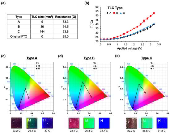 Characteristics of the TLC display in the CIC sensor. (a) A comparison of display sizes and corresponding resistances for the TLCs (Types A, B, and C). The main substrate utilizes fluorine-doped tin oxide (FTO) with a native resistance of 25 Ω. (b) Comparison of applied voltages and the resulting temperature changes for the three TLC displays. (c) CIE 1931 chromaticity diagram of Type A TLC, along with actual images at 23.2 (denoted as L), 26.1 (M), and 30 (H) °C. (d) Type B TLC, featuring actual images recorded at 23.1 (L), 26.8 (M), and 32.7 (H) °C. (e) Type C TLC, with actual images recorded at 22.7 (L), 26.6 (M), and 31.2 (H) °C. Voltages are applied in the range of 0 to 3.2 V.
