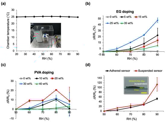 To assess the humidity sensing characteristics of the PEDOT:PSS-mediated sensor, a vapor testing chamber is established, maintaining a stabilized chamber temperature within the range of 20% to 90% RH (Figure 4a). Two dopants, EG and PVA, are employed for this verification, yielding noteworthy results. When doped with 25 wt% EG, the sensor exhibits a remarkably high sensitivity in measuring the resistance change rate (∆R/R0) relative to chamber humidity, especially compared to other EG dopings (Figure 4b). This rate is measured using a multimeter. The resistance change rate varied from 0% at RH 50% to 52.5% at RH 90%. In contrast, the original PEDOT:PSS humidity sensor demonstrates a minimal response, with a mere 1.2% ∆R/R0 at RH 80%, and no significant difference across other humidity levels. Conversely, PVA doping does not enhance detection sensitivity to humidity across all PVA doping groups (ranging from 10 to 40 wt%), as illustrated in Figure 4c.
