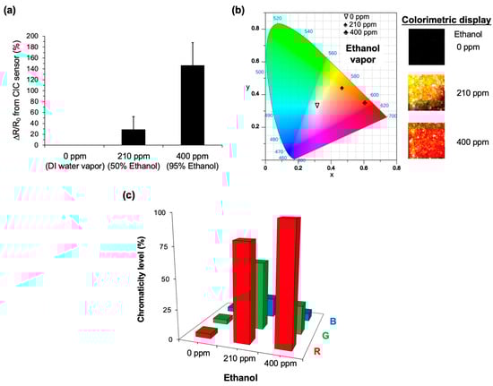 Real-time measurement of ethanol vapor with different concentrations by the CIC sensor. (a) Comparative analysis of the electric resistance measured at ethanol concentrations of 0 ppm (controlled by DI water vapor), 210 ppm (by 50% ethanol), and 400 ppm (by 95% ethanol). (b) CIE 1931 chromaticity diagram of the CIC sensor, accompanied by actual images captured at ethanol levels ranging from 0 to 400 ppm. (c) Comparative analysis of the chromaticity levels (R, G, and B) derived from images in (b). The testing sensor is composed of PEDOT:PSS doped with 25 wt% EG. The voltage input is 2.6 V.
