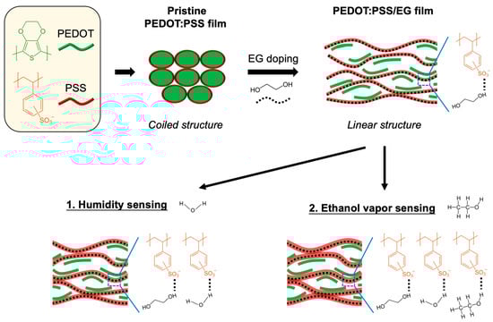 Schematic illustration of PEDOT:PSS with secondary EG doping for sensing both humidity and ethanol vapor.