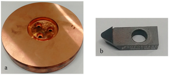 Figure 1. Single-crystal copper workpiece (a) and PCD tool (b).