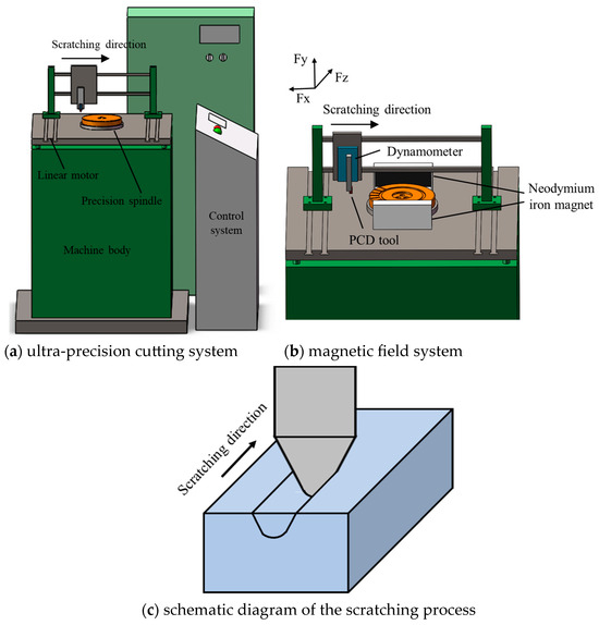 The scratching tests were conducted with a self-developed magnetic-field-assisted machine tool, as exhibited in Figure 2a. The magnetic-field-assisted machine tool was composed of an ultra-precision cutting system and a magnetic-field system; the major components included a machine body, linear motor, precision spindle, control system, and magnetic field system. The ultra-precision cutting system could provide a highest rotating speed of about 12,000 rpm and a repeat position precision of ±2 μm. After adjusting the dynamic balance of the precision spindle, the system could provide an axial runout on the spindle end face of less than 1 μm to enable high-precision scratching depth. On the basis of the ultra-precision cutting system, the magnetic-field system, which was composed of two permanent magnets made of neodymium iron N35H with different polarities, was clamped on the worktable to perform magnetic-field-assisted machining, as shown in Figure 2b. The used permanent magnets were 100 × 50 × 20 mm. To prevent detrimental effects on the ultra-precision cutting system, the permanent magnets were magnetically insulated in the surrounding direction except the direction toward the workpiece using a magnetic isolation cover fixture made of 45 steel material, which could shield more than 96% of the magnetic intensity. The remained magnetic induction line was perpendicular to the scratching direction. The remanence and coercive force generated by the magnetic field system on the workpiece zone were 1.18 T and 880 KA/m.