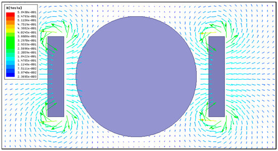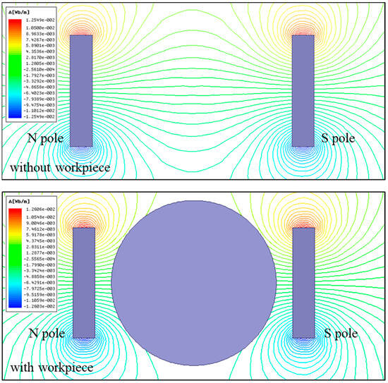 In this work, a magnetic field system was introduced into the scratching process of single-crystal copper. The magnetic field distribution was analyzed using Ansys Maxwell 2020R1 software to investigate its effect on the scratching process. In the magnetic simulation, the iron core sizes were set according to the actual permanent magnets, and the material properties of neodymium iron N35H were as listed in Table 2. Figure 3 depicts the magnetic induction line distribution between the two permanent magnets. By comparison, the magnetic induction line was evenly distributed from the N pole to the S pole in the middle region between the two permanent magnets. And, the magnetic induction line did not exhibit the obvious variation after placing the single-crystal copper workpiece between two permanent magnets. This result was confirmed by the magnetic induction intensity measured using a tesla meter. This implied that the workpiece dud not affect magnetic field distribution between the two permanent magnets. The magnetic flux density distribution from the simulation is exhibited in Figure 4, showing the magnetic field distribution in the workpiece zone, where the arrow represents the direction of magnetic flux density. From the results, it was found that the generated magnetic field fully covered the workpiece and could offer uniform magnetic action in the scratching process.