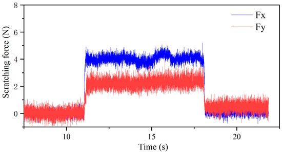 In the scratching test, the recorded scratching force signal was as exhibited in Figure 5. It was found that the scratching force rapidly increased during the cut-in stage and rapidly decreased during the cut-out stage. Because the scratching process is a continuous steady-state cutting process, the scratching force is very stable during the regular scratching stage. The main force components in the scratching process are the tangential force Ft and the normal force Fn, which exactly correspond to the recorded force components Fx and Fy. In this work, the statistical mean of the scratching force components at the regular scratching stage was applied for the scratching force results.