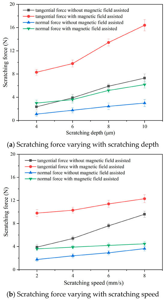 Figure 6 exhibits the scratching forces of the conventional and magnetic-field-assisted scratching processes. Based on the results, it can be seen that the scratching forces of both conventional and magnetic-field-assisted scratching methods gradually increased with increases in the scratching depth and the scratching speed. They exhibit almost the approximate variation trend as that of the scratching parameters. It was found that the tangential force was much bigger than the normal force during the scratching process. However, the tangential force and the normal force exhibit different increase rates: the tangential force exhibits a large increase with the scratching depth and the scratching speed; the normal force exhibits only a slightly increase with the scratching depth and the scratching speed. In comparison, both the tangential and normal forces in the magnetic-field-assisted scratching were obvious larger than those with conventional scratching. The mean values of the tangential force and the normal force in the conventional and magnetic-field-assisted scratching processes were calculated and compared. Under different scratching depths, the mean values of the tangential force and the normal force in the magnetic-field-assisted scratching, respectively, increased 2.46 and 2.16 times of the force in the conventional scratching process, as exhibited in Figure 6a. Under different scratching speeds, the magnetic field action caused the mean tangential force and the normal force to increase to 1.65 and 1.51 times of the scratching forces with conventional scratching, as exhibited in Figure 6b.