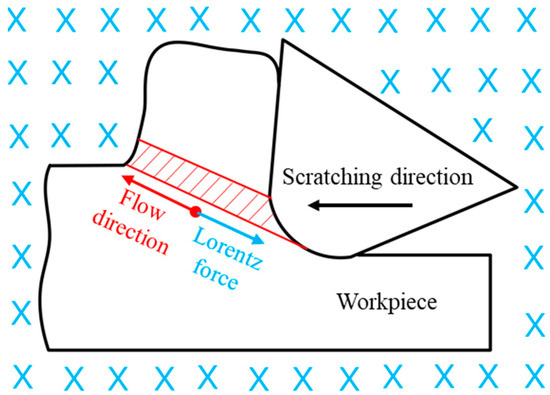 The results show that magnetic-field assistance in the scratching process significantly increased the scratching force. But, the detailed reason for this phenomenon was still unexplored. During the scratching process, when the PCD tool scratches the workpiece in the cutting direction, the workpiece material experiences plastic deformation in the primary deformation zone. This plastic deformation is the plastic flow process of the workpiece material along the shear plane. The material flow direction is exhibited in Figure 7. At the same time, the magnetic induction line in the magnetic-field-assisted scratching process is perpendicular to the cutting cross-section. It is well known that single-crystal copper material is a good electric conductor, so is widely applied in various industries. Hence, the magnetic-field-assisted scratching process can be seen as a process of the electric conductor cutting magnetic induction line, as exhibited in Figure 7. When the electric conductor cutting the magnetic induction line, Lorentz force occurs in the direction contrary to the movement direction. Additional Lorentz force is superimposed on the scratching force. This likely induces the relatively larger scratching force in the magnetic-field-assisted scratching process.