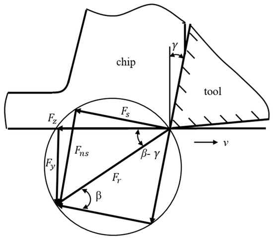 There are two sources of cutting force in the metal cutting process: the elastic–plastic deformation of the metal material in the primary deformation zone, and the friction force in the second and third deformation zones. Among them, the friction behavior in the second deformation zone on the rake face is the main source of friction force in the metal cutting process. The friction coefficient between the chip and rake face significantly affect the cutting force components, the chip morphology, and the surface quality. As exhibited in Figure 8, the scratching process is an orthogonal cutting process; based on Merchant metal cutting theory [31], the friction angle on the rake face can be expressed as: