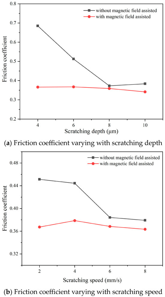 Based on the scratching force results, Figure 9 exhibits the friction coefficient obtained from the conventional and magnetic-field-assisted scratching processes. The friction behavior on the rake face can be divided into two types: adhesive friction and sliding friction. The adhesive friction coefficient is much larger than the sliding friction and is the main factor that determines the friction coefficient on the rake face. In the conventional scratching process without magnetic-field assistance, it was found that the friction coefficient gradually reduced with a raise in the scratching parameters. It reduced from 0.7 to 0.4 when the scratching depth deepened from 4 μm to 10 μm. With a thicker cutting thickness, the chip deformation degree reduced; the extruding and ploughing between the chip and rake face reduced as well, thereby decreasing the adhesive friction and lowering the friction coefficient on the rake face. The friction coefficient slightly reduced from 0.45 to 0.38 when the scratching speed increased from 2 mm/s to 8 mm/s. The effect of the scratching speed on the friction coefficient was weak, being weaker than the effect of scratching depth. It was found that the friction coefficient of magnetic-field-assisted scratching was almost unchanged and stable at 0.36 under various scratching parameters. In comparison, the friction coefficients of magnetic-field-assisted scratching were all lower than those of conventional scratching. This indicated that magnetic-field-assisted scratching exhibited good friction reduction effect; the reduction in the friction coefficient averaged 19.4%. This is consistent with the findings in the literature reporting that magnetic-field-assisted cutting can improve the tribological characteristics of tool/chip contact [26,27].