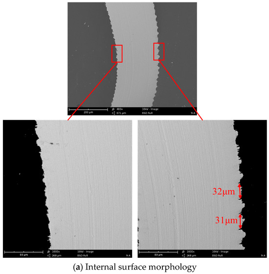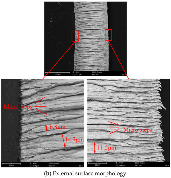 Chip morphology is directly related to the material’s elastic–plastic deformation and the machining quality during the cutting process. The typical morphology of the collected chips is exhibited in Figure 10. It was found that the generated chips presented a flattened shape with serrated morphology on both side edges. The spacing between serrations on the side edge was about 30 μm. This indicated that the chip encountered severe extrusion action and was seriously compressed during the cutting process. The internal surface morphology of the collected chips was very smooth with some microscratches. The internal surface of the chip experienced friction with the tool rake face; a smooth surface morphology formed via serious friction and tension behaviors. However, the external surface morphology of the chip was very rough with many protruded microsteps. These protruded microsteps formed via the plastic shear slipping of the workpiece material along the slip plane in the crystal in the primary deformation zone. A protruded microstep is a shear slip layer, and these microsteps are stacked in layers of these shear slip layers. From the results, the thickness of these protruded microsteps was uneven, changing from 6.8 μm to 14.7 μm. This indicated that the thickness of these shear slip layers changed during the cutting process.