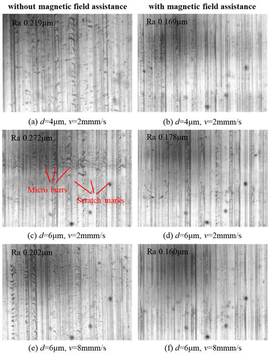 Figure 12 exhibits the bottom surface morphology of the scratched groove obtained with the conventional and magnetic-field-assisted scratching process for different scratching parameters. Scratch marks and microburrs were observed on the scratched groove surface, which were the main surface defects. The scratch marks were similarly distributed on both groove surfaces produced with the conventional and magnetic-field-assisted scratching. However, the groove surface morphology produced with magnetic-field-assisted scratching exhibited fewer microburrs and better surface quality compared with those of conventional scratching. The probable reason is the lower friction coefficient and degree of chip deformation helped to reduce material plastic side flow during the cutting process, which is mainly responsible for microburrs on a machined surface [32]. According to the roughness results, the surface roughness increased with the increase in the scratching depth and decreased with the increase in the scratching speed. In comparison, the surface roughness produced with conventional scratching was larger than 0.2 μm, but it was smaller than 0.18 μm with magnetic-field-assisted scratching. Magnetic-field-assisted scratching reduced the surface roughness by an average of 26.8%. This indicates that magnetic-field-assisted scratching can effective improve machining surface quality.