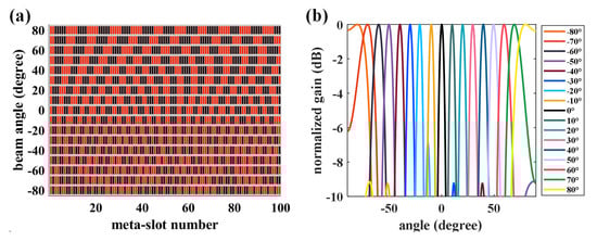 with functioning as a step function. and are the positive real numbers to adjust the distribution range of amplitude values, and we have here corresponding to the energy radiated from per meta-slot. When the phase difference between the required phase shift value and the actual phase shift value at position is small, more energy will be radiated as the state “1”. On the other hand, when is large, less energy will be radiated as the state “0”. On this basis, the meta-slots possessing the phase difference within will significantly contribute to the overall radiation, while the rest of the meta-slots will thus exhibit less contribution to the radiation. The ideal relationship of the 1/0-state of meta-slots over the entire radiating aperture and the prescribed radiating directions can thus be determined, as shown in Figure 2a, with the red ribbon indicating the state “1” and the black ribbon indicating the state “0”, where the graphene-biased terahertz meta-surface has 100 switchable meta-slots. The very closely packed meta-slots fulfill the wide-angle scanning capacity, and we can observe that the ideal steerable beams possess the scanning range from to , as shown in Figure 2b. Unlike the phase array and electronic scanning antenna structure, the amplitude modulation does not need active phase shifters to achieve reconfigurable operations. The meta-slots are equivalent to magnetic dipole coupling guided-wave energy to the free space, and all the meta-slots thus finally form the radiating array. In fact, such an amplitude modulation also includes the phase information, where the guided wave controls the phase of each unit, and we only let the elements meet the phase requirements to radiate.