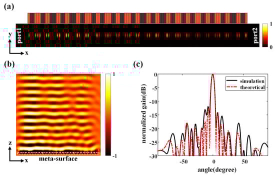 Full-wave simulations (CST Microwave Studio) are carried out in Figure 3 to verify the proposed graphene-biased terahertz coding meta-surface. The elements in different working states will have different effects on guided wave, as the radiation from the meta-slots will affect the transmission of the guided wave and lead to the energy attenuation of the guided wave with additional phase shift [23]. When a low bias voltage is applied to the graphene through gating pads with the chemical potential of 0eV, the meta-slot will function as dielectric windows with very good transmissivity. In such a case, the meta-slot can be modeled as a polarized magnetic dipole with strong radiation ability. The coding graphene element imposed with 0 eV chemical potential will thus turn on the meta-slot as the state “1” for the radiation, and each “1” state of the graphene element introduces a 3.5-degree phase shift to the guided wave. On the other hand, when the chemical potential of the graphene is 1 eV by applying a higher bias voltage to the graphene, the transmissivity of the meta-slot will become very small, and its physical properties will be closer to the conductor. At this time, the meta-slot is similar to the electromagnetic shielding screen with extremely weak radiation capacity of the leakage fields. The influence of such graphene elements on the guided wave can be ignored. Considering the additional phase shift introduced by the element to the guided wave, we correct the phase difference , where indicates that each 1-state element will accumulate a corresponding phase shift to the guided wave. Figure 3a shows the 0/1-state distribution which is slightly different from the ideal state distribution after introducing phase shift and the normalized electric field amplitude distribution at m above the structure of the meta-slot array for 0-degree radiating direction, where port-1 is excited by the quasi-TEM mode and port-2 at the end of the waveguide is used to absorb the remaining energy. Figure 3b shows the normalized electric field magnitude over the transversal plane of the proposed meta-surface. The energy gradually radiates into the free space when the quasi-TEM wave travels along the structure. The electric field intensity distribution obtained by simulation is consistent with the expected results. We can observe that the proposed graphene-biased terahertz coding meta-surface forms an electric field distribution similar to a plane wave propagating in the z-direction which generates a highly directive beam as the numerical analysis. The HPBW of the simulated meta-surface is , and the first sidelobe level is −11.4 dB with the beam pointing at , exhibiting good agreement with the theoretical result, as shown in Figure 3c. The gain of the simulated result is reported to be 11 dBi with 16% total efficiency. The efficiency can be further improved by optimizing the phase threshold and using other modulation schemes, such as grayscale modulation. According to the electric field direction in the meta-slot, the far field is x-polarized and the cross polarization ratio is above 30 dB. The total energy provided in the simulation is 0.5 W, the energy lost in graphene is 0.31 W, and the radiation energy accounts for 0.08 W. The rest of the energy is reflected at the input port or absorbed by the terminal matching load. The slight discrepancy of far field patterns between the theoretical and simulated results is mainly attributed to the coupling between meta-slots.