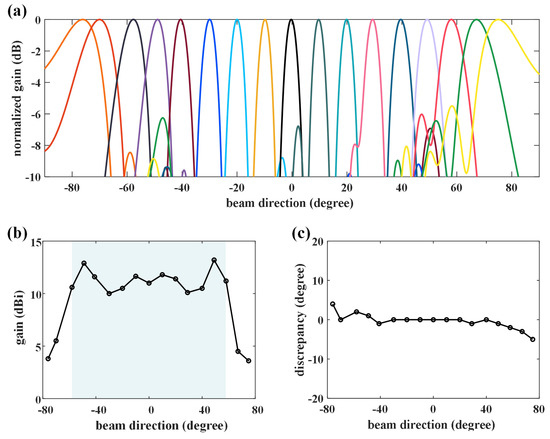 Figure 4 thus demonstrates the beam-steering performance of the proposed graphene-biased terahertz coding meta-surface. Figure 4a demonstrates the wide angle scanning of the proposed graphene-biased terahertz coding meta-surface, where 17 beams are selected to cover the scanning range of from to . The gain values in the main beam directions of all the patterns are shown in Figure 4b, and they are higher than 10 dBi within the scanning range of . When the scanning angle gets larger, the gain will drop accordingly due to the reduction of the effective aperture. The discrepancies between the simulation and the theoretical results are less than 5 degrees, as shown in Figure 4c. It is noted that in such a simulation, we use the ideal monolayer graphene model without considering the defects produced in the practical processing of graphene. With a predetermined bias voltage, the non-perfectness of graphene may make the chemical potential no longer 0 or 1 eV. This will lead to a deviation between the actual beam direction and the expected direction. When the chemical potential changes in a small range, the directional beam can still be formed, but the beam direction will change. At the same time, the realized gain will decrease. The variation of chemical potential has a significant impact on the radiation pattern, because the influence of chemical potential on graphene is not linear.