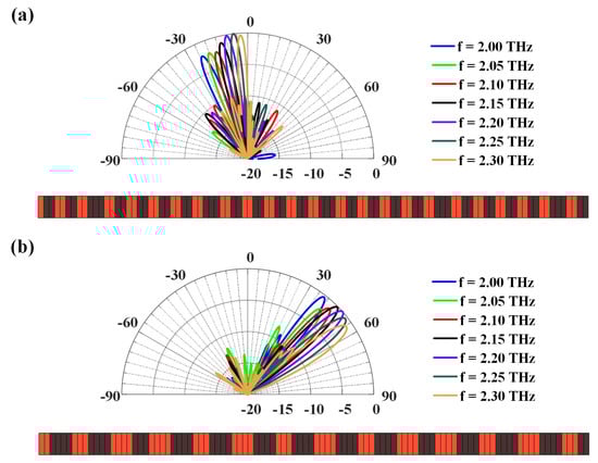 Figure 5 continues to demonstrate the frequency scanning capacity of the proposed graphene-biased terahertz coding meta-surface, where the scanning directions can further be modulated when varying the frequency without changing the coding state of the meta-slot array. For example, the scanning range will have for the original scanning beam when the operating frequency varies from 2 THz to 2.3 THz, as shown in Figure 5a. A lower frequency will have a bigger scanning angle in the backward scanning range, and a higher frequency will make the radiating direction move forward. Every 0.05 THz variation in the operating frequency will lead to an average steerable beam. Similar results can also be obtained for the original scanning beam when the operating frequency varies the same, as shown in Figure 5b. In such a case, a higher frequency will achieve a larger scanning angle and possess a bigger forward radiating direction, while the lower frequency will have a smaller scanning angle, with every 0.05 THz variation in the operating frequency resulting in a steerable beam. The 0/1-state distributions for the original radiation of and are also included. Compared with changing the coding state to achieve wide-angle scanning, the frequency-scanning angle range under a fixed state is smaller, but continuous beam scanning will be achieved by combining the two modulation schemes.
