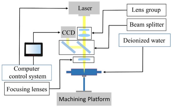 Water-jet-guided laser processing technology is the use of fine water jets to guide the laser to the workpiece to achieve the precision processing of composite processing technology []. Its processing principle is shown in Figure 4. Since water and air have different refractive indices, when the laser beam after the focusing lens focuses on the liquid surface if the angle of incidence is less than the critical angle of reflection, the laser in the water jet will only occur in total reflection without refraction, which makes the laser beam completely restrained in the water jet transmission, coupled with the water jet as one. The water jet acts as a laser fiber and becomes the carrier of laser energy, wherein the laser is guided to the surface of the workpiece to achieve processing.