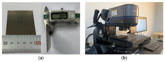 Sample and measurement setup. (a) Inconel 718 sample plate. (b) Ultra-Depth Three-Dimensional Microscope.