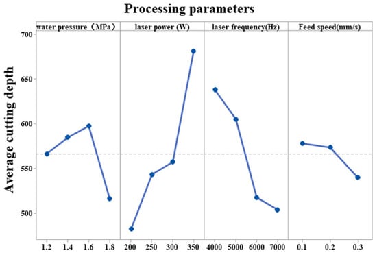 The results of the orthogonal experiments on the depth of the cut is shown in Table 4. The ranking of the S/N values and mean extreme differences in the S/N response table shown in Table 5 and the mean main effects plot shown in Figure 5 describe the degree of influence of four factors on the cutting depth, in descending order: laser power, pulse frequency, water pressure, and feed speed.
