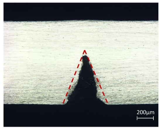 The overall shape of the cross-section of the slit is shown in Figure 6, with a “V” shape. Because of the low thermal conductivity of Inconel 718, although the distribution of laser energy density in the water jet is uniform rather than Gaussian distribution, the hydrostatic pressure is in the middle part of the maximum pressure. Thus, the different degrees of laser energy impact and water cooling caused uneven heat dissipation between the middle part of the material and the surrounding area, and accompanied by the water jet on the scouring of the molten material, the overall shape of the slit presented a “V” shape.