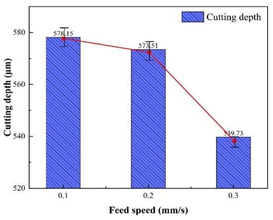 Figure 7 shows the average cutting depth at different feed speeds. When the feed speed increased from 0.1 mm/s to 0.2 mm/s and 0.3 mm/s, the average depth cutting decreased by 4.64 μm and 33.78 μm for multiple experiments. This was because the feed speed decided the length of time that the water jet carried the laser interaction with the material: the slower the feed speed, the longer the laser energy acts on the material, and the deeper the material reaches the melting threshold, the greater the cutting depth.