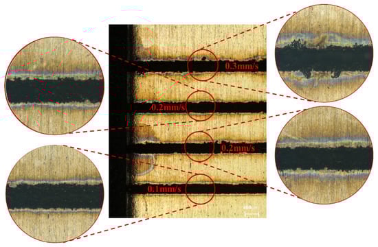 Figure 8 shows the surface morphology of the cut at different feed speeds. When the feed speed was 0.1 mm/s, the kerf shape was neat, the burns range was small, and the slag was less. When the feed speed increased to 0.2 mm/s and 0.3 mm/s, the burns of the kerf edge were gradually severe, the spatter and slag increased, and the overall machining quality decreased. The formation mechanism of the incision was the water jet carrying laser energy on the surface of Inconel 718 material, wherein the material rapidly heated up and heat transfer occurred towards the surroundings when the material temperature reached the melting threshold after melting, vaporization, and the formation of plasma. In between the laser energy pulse accompanied by the cooling and cleaning of the water jet, the heat of the ablation area was rapidly released, and most of the molten materials were washed clean by the water jet, and thus the incision was formed, and solidification occurred in part, forming slag and a recast layer on the surface of the incision. This shows that the feed speed also affected the degree of kerf ablation and the degree of slag residue. When the feed speed was larger, the water jet had a short cooling effect on the material, and the material surface was severely ablated. When the feed speed was reduced, the water jet acted on the material surface for longer. Moreover, more heat was able to be taken away during the laser pulse, thus reducing the heat transfer and heat accumulation in the material.