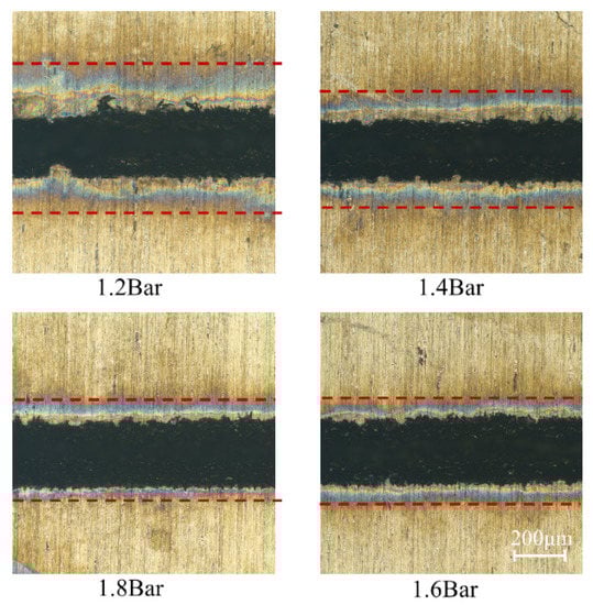 As can be seen from Figure 9, as the water pressure increased, the extent of ablation at the edge of the cut decreased, and the cut was neater. The reason was that as the water pressure increased, more heat was absorbed by the water jet in the material between laser energy pulses, which reduced the burns caused by heat accumulation on the material surface. At the same time, the increase in water pressure will bring more impact to the material and remove more slag from the edge of the cut. Therefore, the water pressure had an important effect on the formation of the material surface morphology.