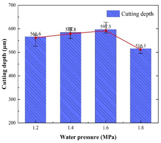 The average cutting depth at different water pressures is shown in Figure 10. It can be seen that when the water pressures were 1.2 MPa, 1.4 MPa, and 1.6 MPa, the average depths of cuts were gradually increased to 556.6 μm, 584.8 μm, and 597.5 μm, respectively. The reason was that the high-speed water jet can enhance the removal of molten material from the groove. Moreover, the stable water jet was also able to achieve higher quality water-laser coupling, which can transmit more laser energy to the depth of the cut. When the water pressure was 1.8 MPa, the cutting depth decreased. The excessive water jet velocity during the laser energy pulse led to the absorption of most of the energy transferred by the laser to the material by the water jet, and the high-pressure water jet at the depth of the cutting seam was severely scattered. Thus, more laser energy cannot be transferred to the depth of the material cutting seam, resulting in a decrease in the heat accumulation of the material at the depth of the cutting seam, and the material part reached or was unable to reach the melting threshold. Therefore, the cutting depth showed a downward trend when the water pressure was too high.