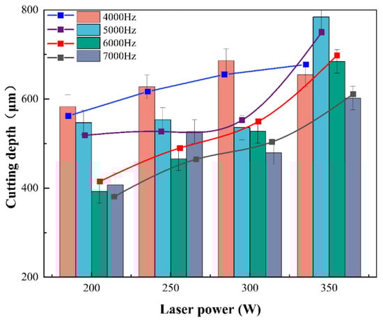 Cutting depth at different laser powers and pulse frequencies (excluding 1.8 MPa water pressure).