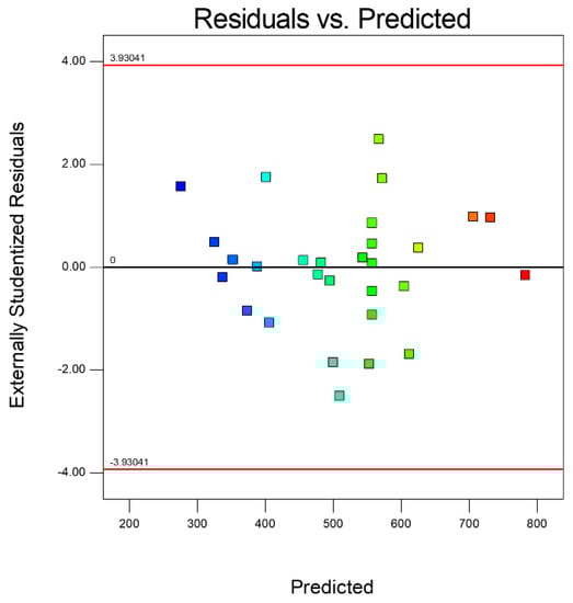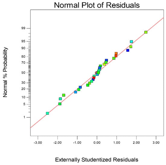 Figure 13 shows the residual normal distribution of the cutting depth prediction model. The residual value of the model was uniform in a straight line, indicating that the predicted value of the model for cutting depth was in good agreement with the actual value. Figure 14 shows the residual distribution between the actual value and the predicted value. It shows that the data were scattered and irregularly distributed above and below the average line, which means the developed model was recognized to be statistically significant.