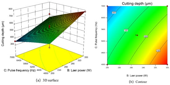 Figure 15 shows the 3D surface plot (Figure 15a) and contour plot (Figure 15b) of the effect of the interaction term BC on the response value, i.e., the pattern of laser power and pulse frequency on the cutting depth. It can be seen that when the laser power was constant at the center point 275 W, with the increase in laser pulse frequency (4000 Hz, 5500 Hz, 7000 Hz), the cutting depth gradually decreased. When the laser power was 200 W and the pulse frequency was 7000 Hz, the single-pulse energy is the smallest, the cutting ability of the material was the weakest, and the cutting depth was the shallowest. Therefore, the way to obtain a deeper cutting depth was to select the laser power of 350 W and pulse frequency of 4000 Hz.