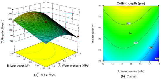 Figure 16 shows the response surface plot (Figure 16a) and contour plot (Figure 16b) of the effect of the interaction term AB on the response value, i.e., the pattern of water pressure and laser power on the cutting depth. When the laser power was fixed at the center point of 275 W, the cutting depth increased first and then decreased with the increase in water pressure (1.2 MPa, 1.5 MPa, 1.8 MPa). This also had an important relationship with the stability of the water jet. When the water pressure is small, partial molten materials cannot be excluded at the depth of the slit, and there is no way to remove deeper materials. When the water pressure is too large but unstable, the laminar flow state of the water jet is destroyed, which leads to a significant weakening of the coupling effect and a serious loss of laser energy in the transmission process, and thus a deeper cutting depth cannot be achieved []. It can be seen from the response surface Figure 16a that when the water jet pressure was above 1.65 MPa, the predicted cutting depth reached the optimal.
