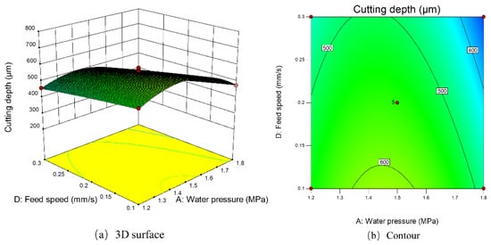 The 3D surface and contour map of the influence of feed speed and water pressure on cutting depth.