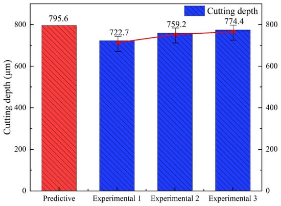 In order to verify the prediction accuracy of the prediction model, three cutting experiments were carried out with the optimal parameters. The results of predicted values and experimental results are shown in Figure 18. The cutting depths were 722.7 μm, 759.2 μm, 774.4 μm, and the average depth was 752.1 μm. As shown in Table 8, the error between the actual value measured in the experiment and the predicted value obtained by the prediction model was 5.5%. This shows that the model has a high predictive ability for cutting depth.