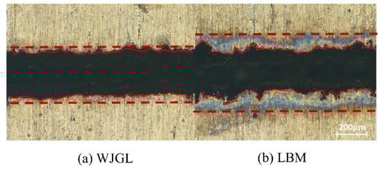 Figure 19 shows the comparison of Inconel 718 cut by WJGL (Figure 19a) and LBM (Figure 19b). The incision burns under WJGL were greatly reduced. Figure 20b is the use of the same optimal process parameters, increasing the number of cutting toolpath (from two to four times) cutting results, wherein the thickness of 1 mm of the Inconel 718 plate was cut through.