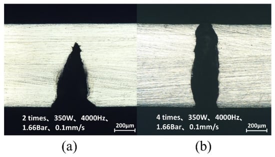 When the laser power is 280 W and the pulse frequencies are 4000 Hz, 5000 Hz, 6000 Hz, and 7000 Hz, the single pulse energies transmitted to the material, in theory, are 0.070 J, 0.056 J, 0.047 J, and 0.040 J, respectively. Considering the energy absorption of the water jet and the heat loss of energy on the material surface, the energy transmitted to the material is much lower than this value. As the pulse frequency increases, the single pulse energy density becomes smaller, while the water jet causes cooling to the material during the laser pulse interval. Therefore, a higher laser pulse frequency makes the material absorb less laser energy per unit time, causing shallower cutting depth. This is the same as the research results of Z et al. [].
